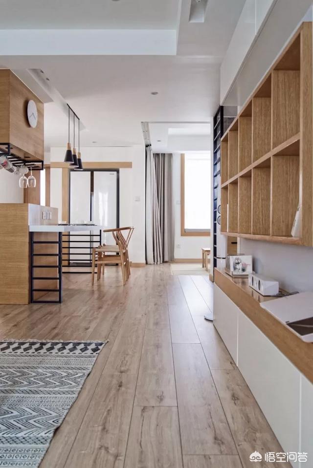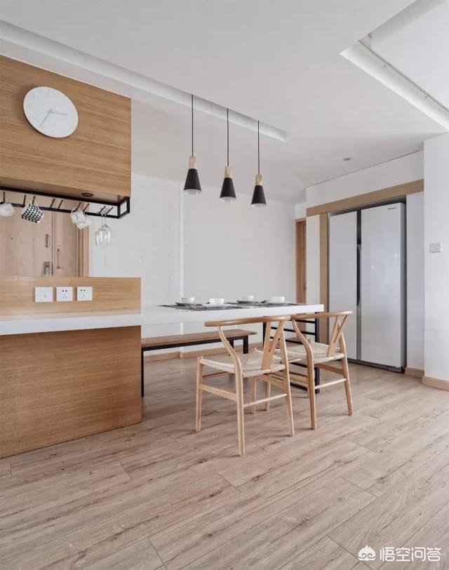 在墙体中隔出了超大的双开门冰箱 的空间,内嵌入式的设计不占用多余的空间,非常方便使用。读者家除了卫浴间以外的所有地方全部使用柏林地板,打造淡雅禅意的摩登日式风格。日式装修要注意防潮:建议在铺地板之前,在地上先打龙骨,使之与地面有一定的距离。