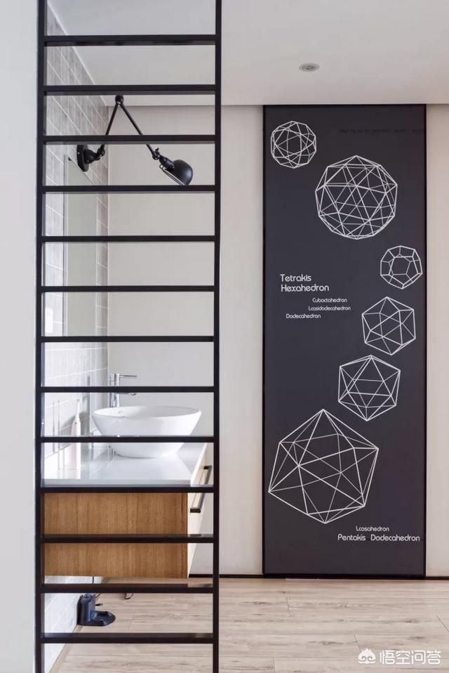 将卫生间的干湿区分离,450mm*450mm的碗形台盆小巧可爱,由于干区的橱和台面完全腾空的,为了呈现出最好的效果,现场制作的难度还是比较大的,卫生间的移门是一面镜子,背面贴上几何画贴就像是一面黑板墙。要注意,黑板漆 一定要选环保的,日后有了孩子,也是提前做了对孩子的保护。