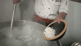 从雷公山托运过来的山泉水,把水烧开放糯米和糯包谷,搅拌持续不断冒30分钟,直到把糯米煮到开花之后,关火冷却,温度降至80度左右放自家做的甜酒酿。