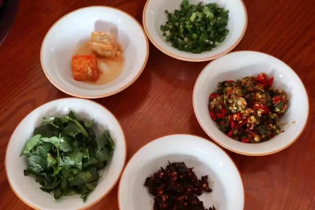 不同的菜,配不同的蘸水。酸汤的蘸水,用烧青椒、糊辣椒、姜、蒜、木姜子擂在一起 ,配酸汤牛肉,微辣惹鲜,滋味更加美貌。