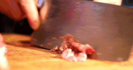牛肉坚持用刀来切,目的是为了保持牛肉的新鲜度,好的牛肉一定要顺着牛肉的纹理来切,这样才能吃出牛肉最精致的口感。