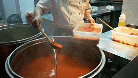 再选用本地小毛辣角和糟辣椒打成酱的酸加在酸汤里,一锅清香、微酸、回甜、清冽的酸汤就制作完成。