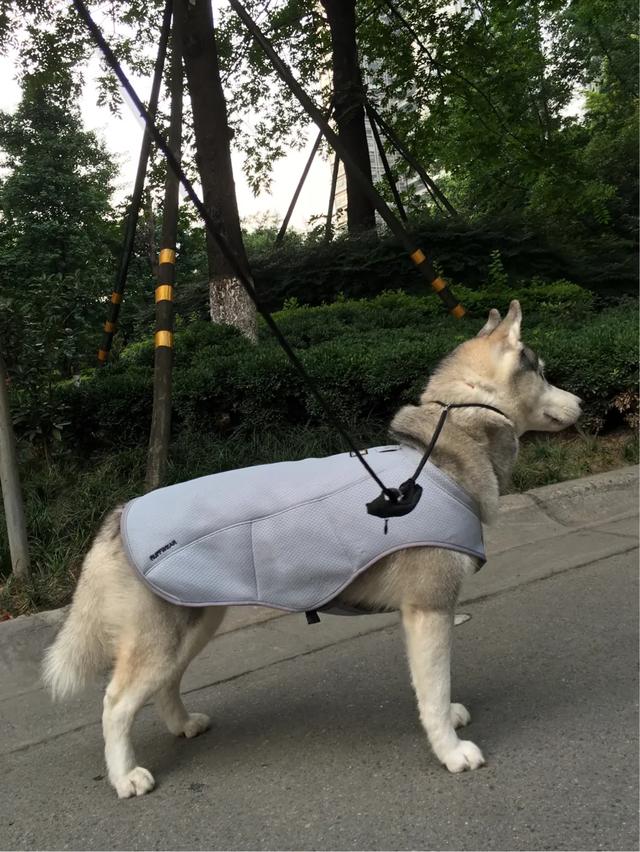 2.太阳没那么大的时候,出门遛狗可以在网上给狗子买一些装备进行物理降温,图上装备的作用原理,就是淋湿了的衣服穿在身上,通过不断的水分挥发,吸走周围的热量。亲测效果是不错的,有条件的小伙伴可以考虑一下。
