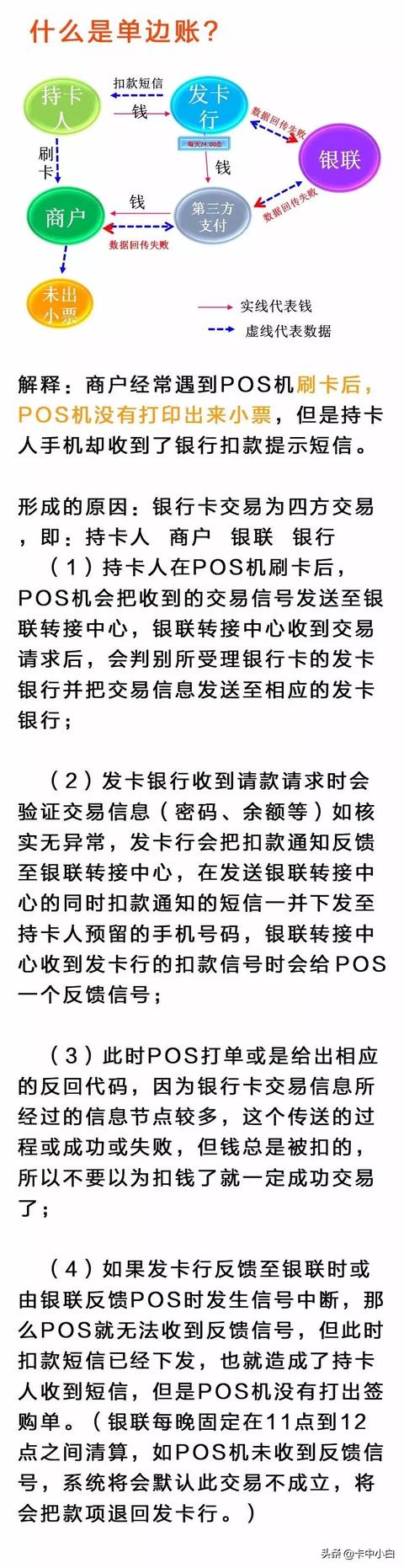 日常生活中刷卡交易的时候我们会遇到“调单”“单边账”等各种问题。银行卡交易主要为四方交易:持卡人、商户、银联、银行。很多时候,银行卡交易信息过程中有可能失败,钱虽然被扣了但是由于发卡行反馈至银联时或者银联反馈POS机时信号中断,那么POS机无法接受到反馈信号,也就造成了持卡人收到短信但POS机没有打出签购单 ,也就是单边账现象。那我们日常生活中遇到单边账的现象怎么办呢?