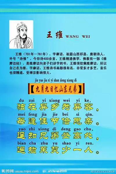王维参禅悟理,学庄信道,精通诗、书、画、音乐等,以诗名盛于开元、天宝间,尤长五言,多咏山水田园,与孟浩然合称“王孟”,有“诗佛”之称。书画特臻其妙,后人推其为南宗山水画之祖。苏轼评价其:“味摩诘之诗,诗中有画;观摩诘之画,画中有诗。”存诗400余首,代表诗作有《相思》、《山居秋暝》等。著作有《王右丞集》、《画学秘诀》。