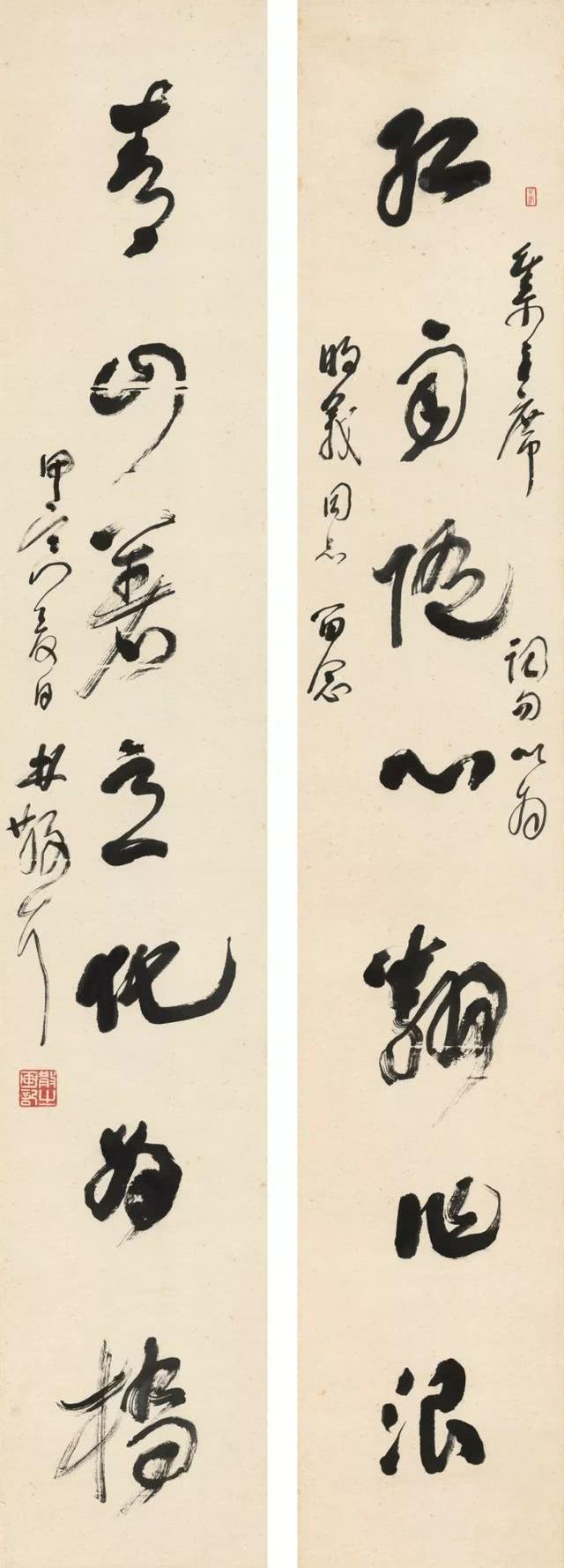 林散之先生草书瘦劲挺拨、疏密恰当、奇正相生,墨色淋漓。下图草书七言联"红雨随心翻作浪,青山着意化为桥“选自毛泽东主席诗词《七律二首.送瘟神》其二。