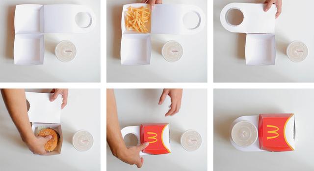 这是设计师Rob Bye为麦当劳的汉堡带来的一个包装设计,和现在M记惯用的纸盒+纸袋+塑料袋的包装相比,这款改进版的包装,用一个盒子就将薯条、汉堡和可乐全部装了进去,更加节约材料。