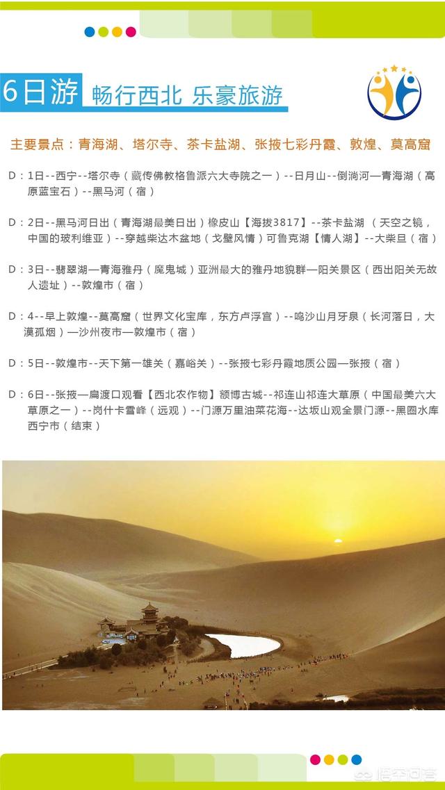 我是从北京走港澳线转京昆线到陕西的榆林,住一宿,第二天走京藏线到西宁住宿,走京新线经历史文成公主的日月山到盐湖茶卡。参观后盐湖,走309国道到青海湖的黑马河住宿,看青海湖的日出。后走环湖路到西海镇金银滩和原子城游玩两天带歇脚。从西海镇至甘肃的张掖参观马蹄寺,丹霞地貌。张掖至嘉峪关游嘉峪关和长城第一墩。嘉峪关住宿。从嘉峪关至敦煌,参观月牙泉,鸣沙山,阳关遗址,莫高窟。敦煌至九泉休息。第二天至往酒泉卫星发射基地。休息参观两天,走航天路至额济纳旗看胡杨林风景。少息走京藏高速横穿巴丹吉林沙漠至乌拉特前旗休息住宿。第二天走包头和呼和浩特张家口回京。特别是西海镇至张掖一路看够了雪山草原,路过海拔3907米山峰,到了张掖的民乐县满山遍野的油菜花。这一路美丽的风景尽收眼底。全程5800公里。