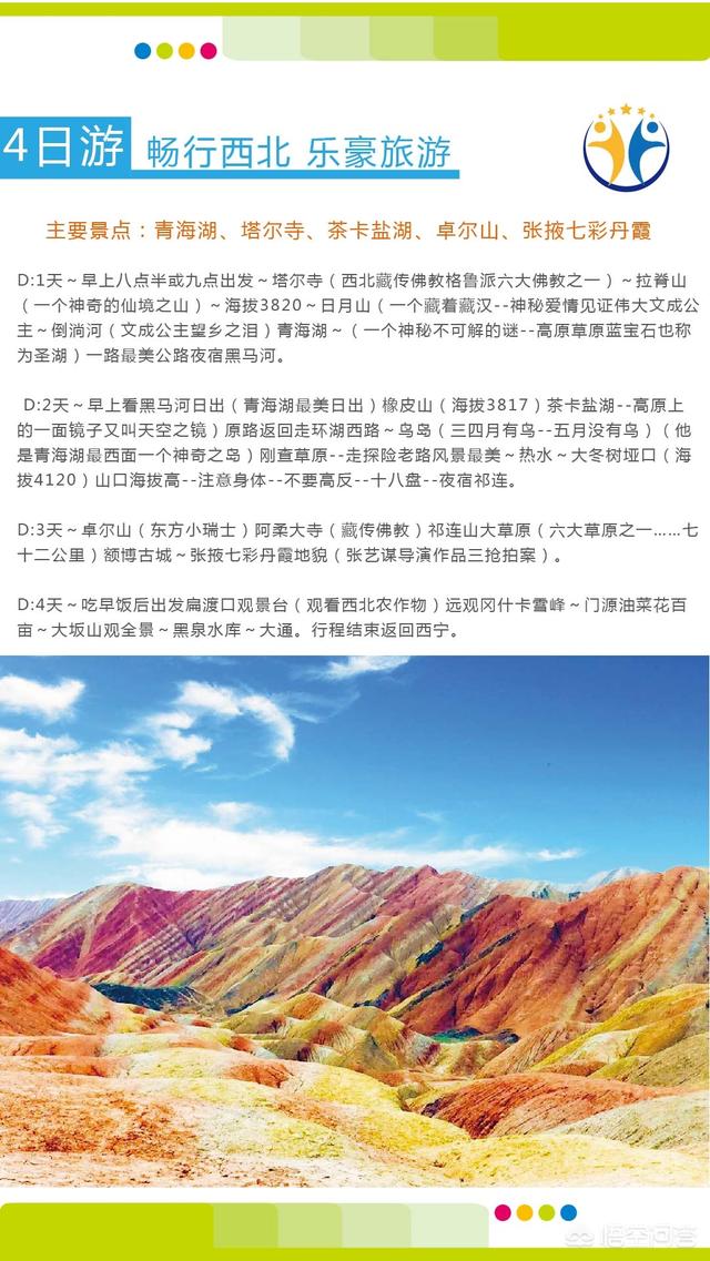 第四天早上出发去青海湖,环湖一般情况下过日月山倒淌河,然后到二郎剑风景区,这里是青海湖最美的地方,也是中国第一个导弹基地。在二郎剑风景区游玩以及吃饭,然后再向前出发,直到黑马河住宿休息。这一路上都在湖边走,所以可以随时停下到边里游玩,不过湖边需要花钱的,一定要给藏民钱,以后再进去,省得引起不必要的误会。第五天早上出发去茶卡盐湖,茶卡盐湖,据说是王母娘娘掉下的镜子,是天空之镜,查卡盐湖大约呆两小时左右再回到青海湖边,继续向北走过鸟岛,然后去往祁连县,在祁连县住宿。第六天在祁连县看牛心山和卓尔山,牛心生,山顶常年积雪,山下麦浪滚滚,可以体验一山看四季,祁连山下好牧场说的就是牛心山坡上。卓尔山,牛心山隔河相望,他俩还有一段爱情传说,这里有小瑞士之称,尤卓尔山大概两三个小时。然后出发向西宁往回走,路上随走随停参观游览,到门源时可以参观门源的百亩油菜花海,七月中下旬是门源油菜花开的正旺盛的时候,过了门源以后就可以直接回到西宁市住宿,到西宁时估计已经,晚上八九点钟了。在宾馆住宿一晚后,第二天不用早起,起床后去到西宁市内墨家街买一些旅游纪念品,然后去市内的大清真寺参观大清真寺,在礼拜日的时候,四周都要封路来进行信徒礼拜活动,到时路上会跪满人群。离大清真寺不远的马步芳公馆,不知道今年会不会开放,那里是西北军阀马步芳的旧居,里面有他的地道,可以参观一下,还有他警卫营的宿舍,也可以参观一下。然后就是,有南禅寺和北禅寺,可以去参观一下,南禅寺是最早的关公庙逐渐发展出来的有关公庙,佛教庙以及道观几种形式的建筑在这里边。在西宁住最后一晚上后,就可以准备回北京了。