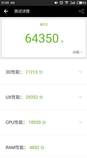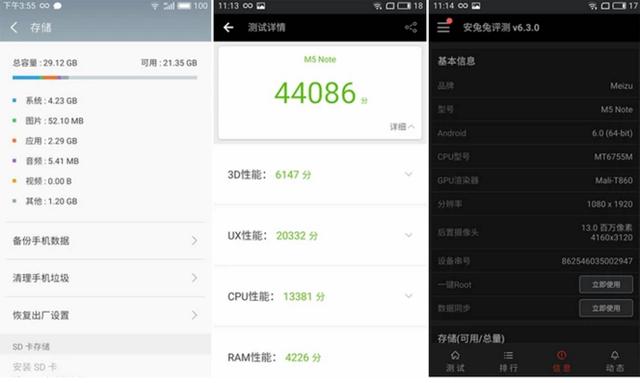 魅蓝note5采用了联发科P10加上3G内存配置,3D、UX、CPU、RAM各项评分分别为6147分、20332人、13381分和4226分,安兔兔跑分这44086分。