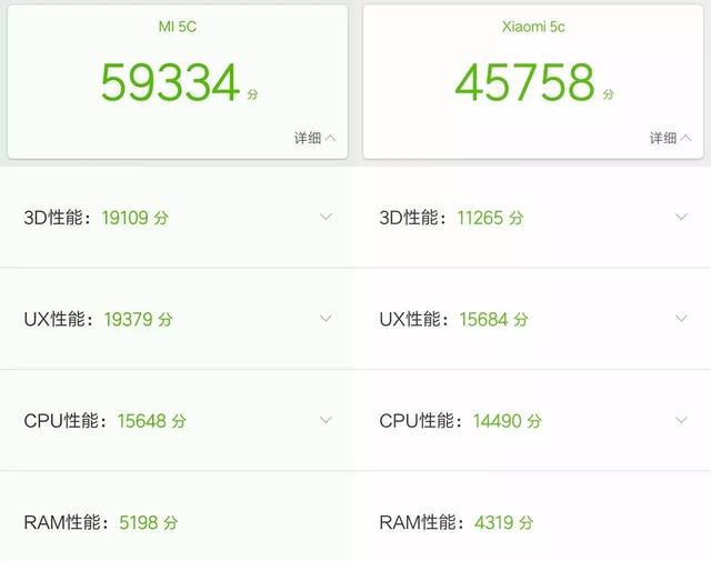 先来看小米5C使用了小米自己推出的澎湃S1处理器。那么表现到底如何呢?以均衡跑分为例,其3D性能跑分达到19109分,UX性能达到了19379分,CPU性能15648分,而RAM性能为5198分,安兔兔跑分59334分。