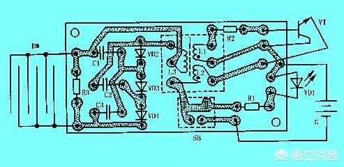 上两图为电蚊拍电路构造图和反面电路焊接规划电路图!图中,发光二极管VD1和限流电阻器R1构成指示灯电路,用来指示电路通断状态及显示电池电能的耗损情况。晶体管VT选用2N5609型硅NPN中功率三极管,VD1用φ3mm红色发光二极管,VD2~VD4用1N4007型硅整流二极管。R1~R3均用金属膜电阻器。C1~C3一律用高压电容器(大于2kv),SB用6mm×6mm立式微型轻触开关。G用5号干电池两节串联(配塑料电池架)而成,电压3V。