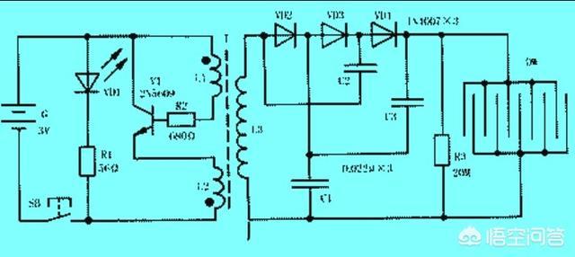 电蚊拍也叫电蝇拍,电蚊拍的工作原理主要由高频振荡电路、三倍压整流电路和高压电击网DW三部分组成。当按下电源开关SB时,由三极管VT和变压器T构成的高频振荡器通电工作,把3V直流电变成18kHz左右的高频交流电,经T升压到约800V(放电距离估测),再经二极管VD2~VD4、电容器C1~C3三倍压整流升高到2500V左右,传输到蚊拍的金属网DW上。当蚊蝇触及高压电网时,虫体造成电网短路,即会被电流、电弧杀灼或击晕、击毙。