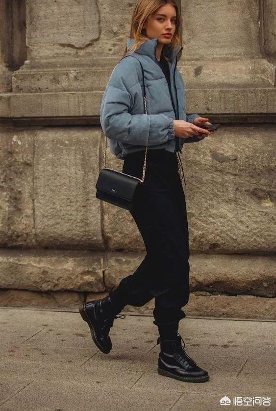 短版羽绒外套简单搭配一件修身裤,营造出上宽下窄的视觉效果,还可以提高腰线,显得让你更显腿长。