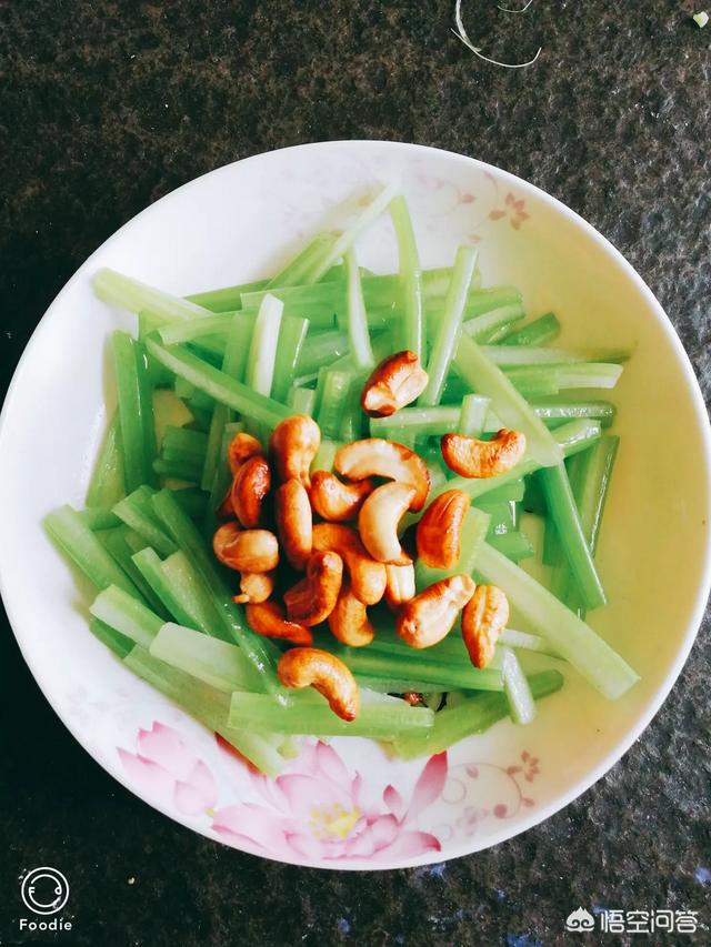 腰果西芹。西芹切块备用,腰果用水洗一下,锅中放底油,把腰果用小火焙到发黄出锅备用,锅中再放油花椒,花椒变色后放盐再放西芹翻炒几下,放一些鸡精提鲜入盘,把熟的腰果放在盘中即可。(也可快出锅时放腰果,我出锅后放是好看)