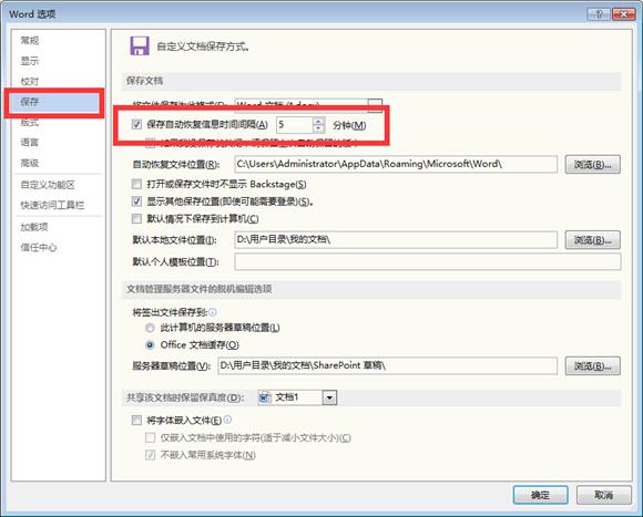 然后就在“保存”的选项中,将右侧的“保存自动恢复信息时间间隔”进行设置就行。