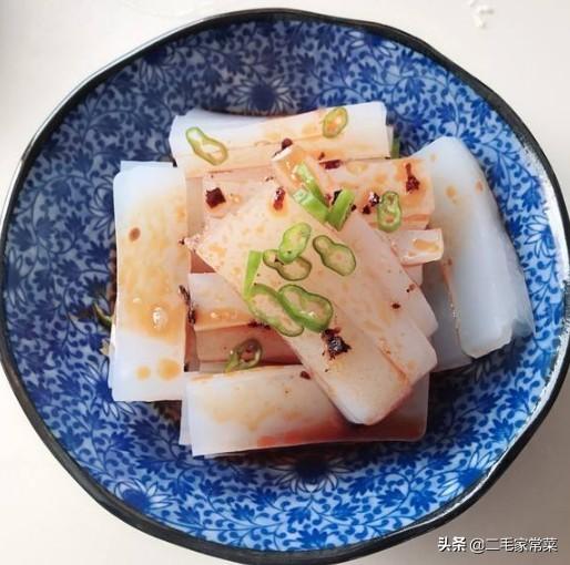 也可以用淀粉代替白凉粉做凉粉的,只需要先用水将淀粉化开,再起锅烧热水,水沸腾后将淀粉水倒入锅中,至锅内液体冒泡并呈透明状即可盛出来冷却,接下来切条并调味就能食用了。