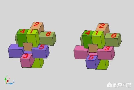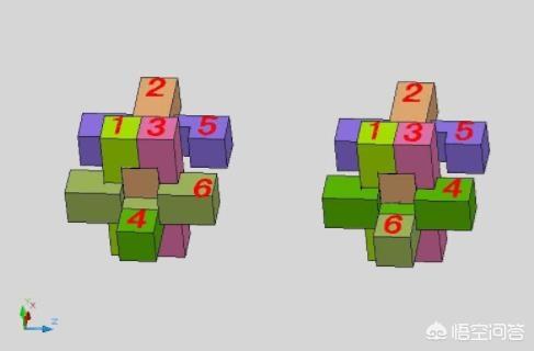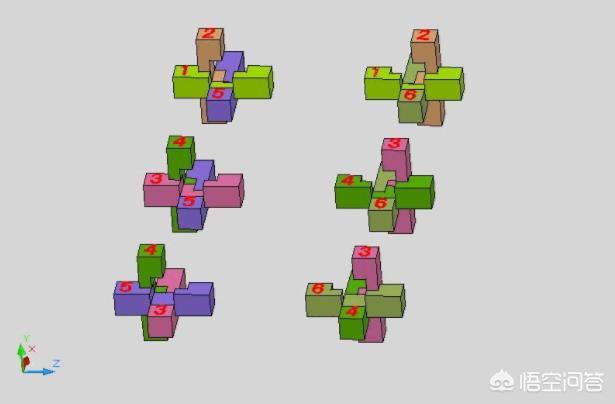 这是一个在用《鲁班锁(孔明锁)的结构分析法》计算25个可锯块可拼合多少个锁的计算中发现的6柱组,它可以有8种不同的拼合方法。现在将它作为《鲁班锁(孔明锁)的结构分析法》使用实例来分析,以补《鲁班锁(孔明锁)的结构分析法》之九被判“私有”,不可公开的缺憾。 这是这个6柱组: