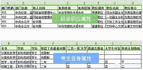 如图所示,在国考职位表中,上面绿框为招录职位属性,下面蓝框为考生自身属性