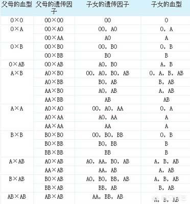 之所以会出现不同的血型,主要就是因为其中包含的遗传因子的不同,详细以下表为例。