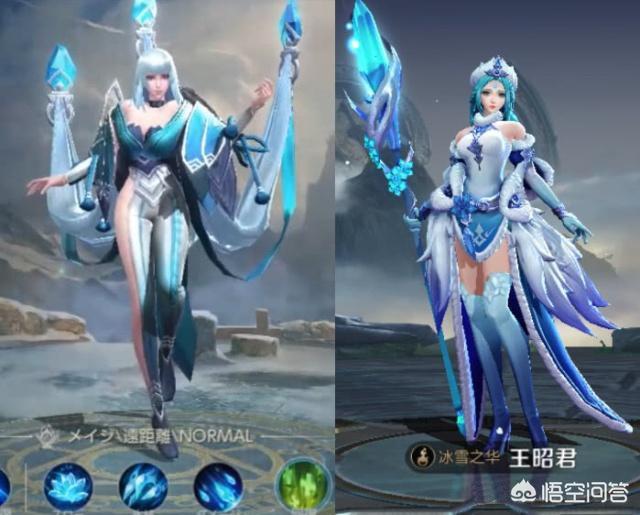 从这张对比图中我们可以看到,左边日版王昭君的服装以蓝青色为主,满头的白发让她看着十分地高贵冷艳,并且右边开衩到腰部的连体服装也是让王昭君性感十足。在英雄界面选择了王昭君之后,一阵清脆动听日语台词响起,王昭君便会化身为冰雪女神在空中起舞,最后坐在女王宝座上。而这样的场景也让王昭君有一种冰雪女王艾莎的感觉。相比国服的王昭君来说,似乎更符合冰雪女王的气质。那么大家觉得日版的王昭君好看还是国服的王昭君好看呢?
