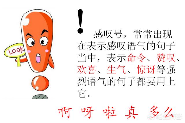 感叹号主要出现在表现感叹语气的句子中,这个语气的体会是比较难的,相对前面三个符号,这个感叹号更难一些。