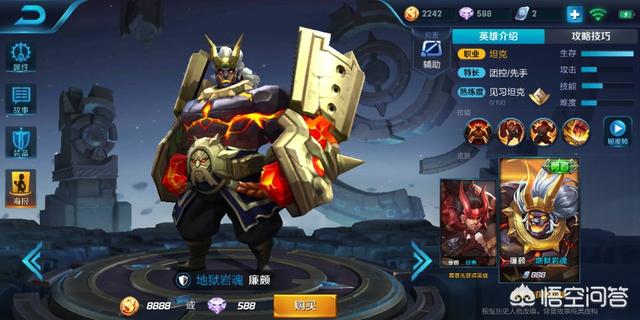 地狱岩魂,相当霸气的名字,可是这黑炭一般的夹杂着火光的瞳孔着实不如它的名字霸气。两只岩浆手臂上的盾牌就像是动画效果一般,毫无地狱之阴森气息。这倒也就算了,可是廉颇明明是一位元老级的英雄了啊,两年多才出了一个皮肤?连个288的都不给糊弄着弄上个吗?