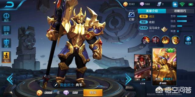 而典韦的这款皮肤叫黄金武士,嗯!确实是黄金的颜色,但是总有种怪怪的感觉,萌萌的有木有,一点都不威猛。相对于钟馗来说配置要高一点,888点券,不过也是一个。典韦:老子一天要斩多少个人头,老妈你直接告诉我具体我要斩多少人头才给我做皮肤?