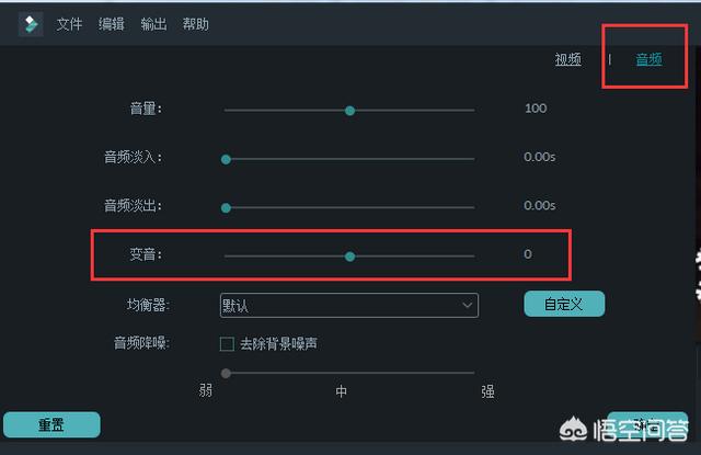 在编辑界面,选择“音频”编辑功能,看到”变音’功能,通过调节可以将音调变高或者变低沉。