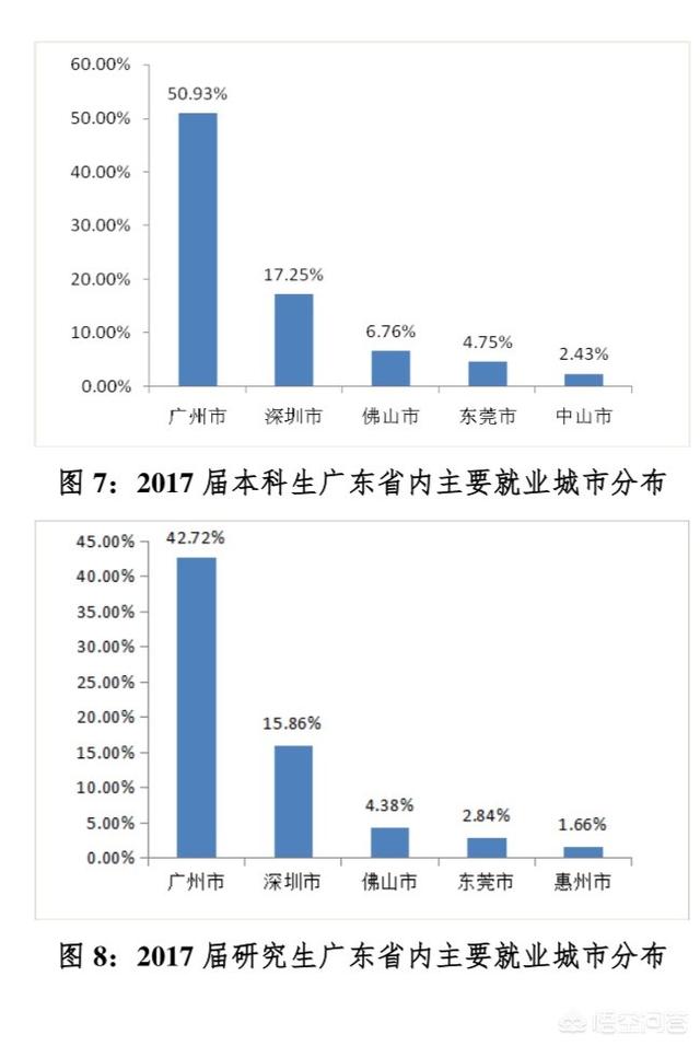 2017届毕业生在广东省内就业集中在广州市、深圳市、佛山市、东莞市等市,省内就业城市分布详情如下图。2017届本科生在广州市和深圳市的就业人数比例为68.18%,研究生在广州市和深圳市的就业人数比例为58.58%。