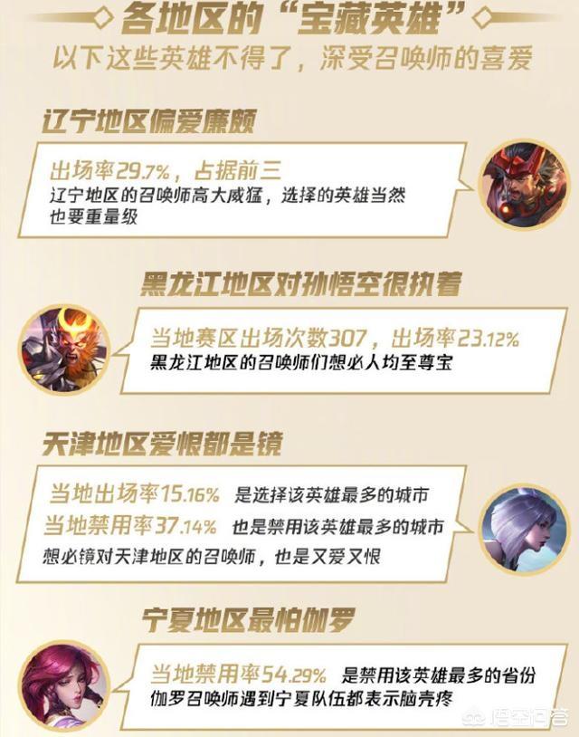 黑龙江:孙悟空出场率23.12%,这是多么喜欢这个英雄,如果说廉颇是版本热门的边路、打野英雄,那么孙悟空绝对是比较弱势的打野,但即便如此,黑龙江玩家也特喜欢拿他,除了钟爱还能说什么呢?