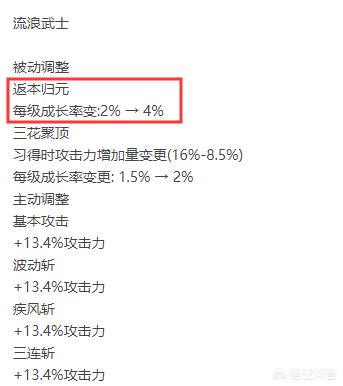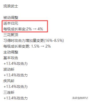 在这场的三觉的专属平衡中,剑豪返本归元的成长率从2%加强到4%,其他基本主动技能都是13.4%的提升,但其实在9.24日第一次国服特色早就对剑豪的返本归元进行了返本改动,也就是说国服所谓的特色加强其实就是三觉数据的更新。