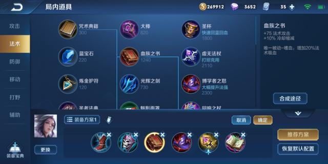 前三件冷却鞋,面具,小吸血书,加上铭文附带的10%的冷却可以将冷却值达到最大的40%!至于为什么不推荐圣杯主要是圣杯的攻击力太低了,经常听到队友抱怨法师没有输出就是这个道理,如果法师都打不出输出的话团战是很难打赢的,中后期一波团战只要法师学会控制蓝量,即使不出圣杯也是够用的,而且面具以及大吸血书(后期小吸血书转大吸血书)提供了不俗的血量,后期由于大家都攻击都上来了,所以增加一定的血量还是需要的。至于第五第六件装备看情况出了,如果顺风局,可以出法穿杖,或者大书,如果逆风局并且对面的carry能力很强,可以出辉月或者复活甲保证生存率。