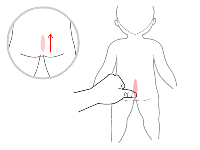第二个,揉龟尾(尾骨端的凹窝处,也就是大人的长强穴),100~500次