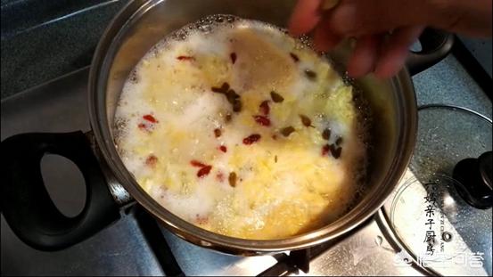 3)等到水再次烧开的时候, 放入枸杞子,稍微煮上半分钟,要出锅的时候,倒进葡萄干。