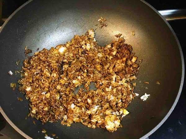 (2)加入酱油;(炒的时候尽量让米粒分开,看起来分明一点)
