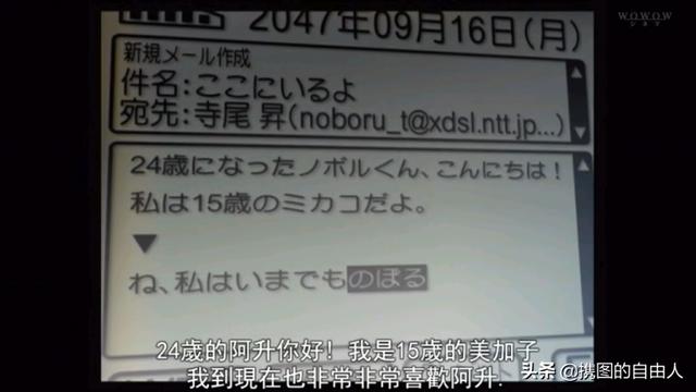感觉有点像牛郎织女似的故事,所不同的是不仅空间错位,时间也错位了。说实在的,我觉得美加子那么执着于青涩懵懂的初恋,可能只是因为那花蕾尚未绽放就戛然而止,人又被甩到那么遥远的地方(那可谓真正的异乡),无依无靠又寂寞,需要这份感情作为锁链将她和故乡相连吧。