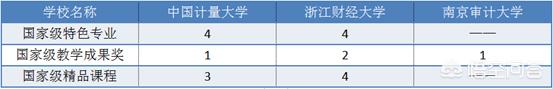 下图可知,在国家级特色专业、国家级教学成果奖以及国家精品课程等方面,浙江财经大学最多,中国计量大学次之。