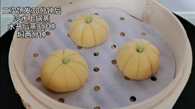 5.包好的南瓜红豆包要二次饧发30分钟,然后放进蒸笼里冷水上锅蒸,水开后蒸8分钟,焖两分钟后就可以出锅了。
