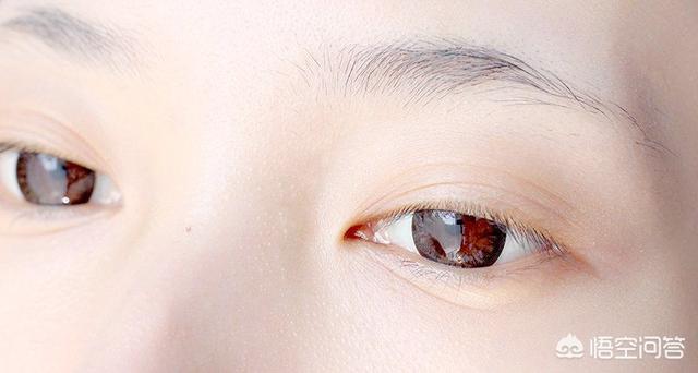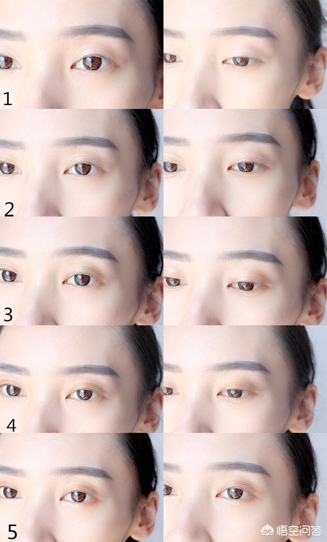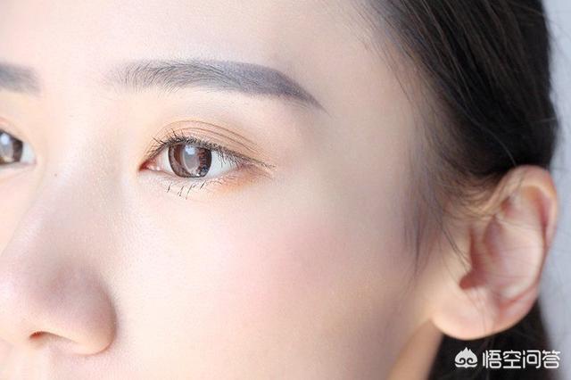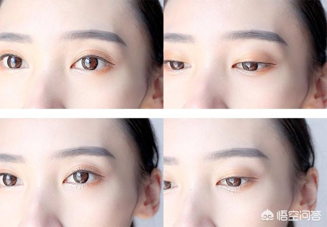 眼影直接上图解是不是比较好理解,先用珠光白在眼窝处打底,眼头和下眼角卧蚕的位置也带一下。然后用很淡的亮橘色的画在双眼皮的褶皱处,最后用一个黄褐色的刷在眼头和眼尾的位置,刷完晕染一下,下眼尾也要刷到。然后可以用浅色的珠光在眼中的位置点一下,就是偏闪的那种感觉。