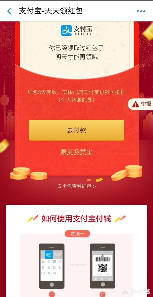 实体店付款红包,余额宝红包,花呗余额宝红包,一天只能领取一次。