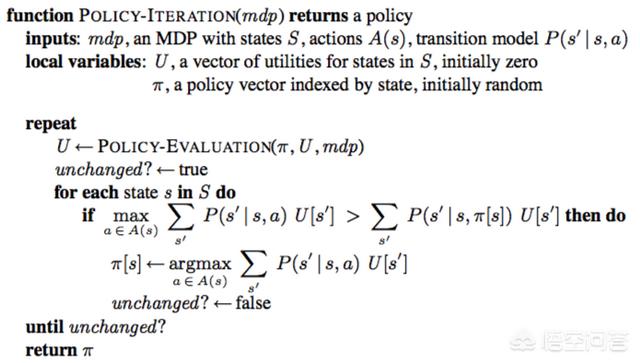 目前在人工智能领域采用合理Agent的途径是比较常见的研究方式,因为这种方法更经得起科学发展的检验。当前人工智能的研究内容包括问题求解(搜索)、知识表示、推理与规划(一阶逻辑、经典)、概率推理、机器学习(样例学习、强化学习、深度学习)、自然语言处理、感知、机器人学等。看一个策略迭代算法(计算最优策略)的流程: