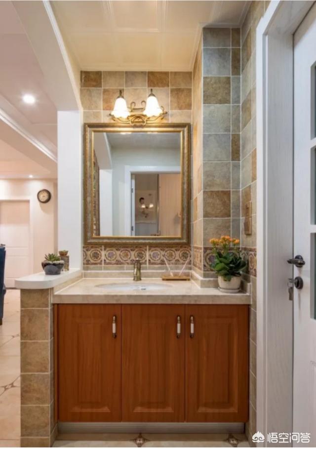 卫生间做成干湿分离的效果,洗漱区的墙打通一半,扩大了视线贯通。这样的设计非常方便生活,干区的定制洗手池搭配美式风格的瓷砖和镜子,让卫生间位置的整洁、风格都表面出来。