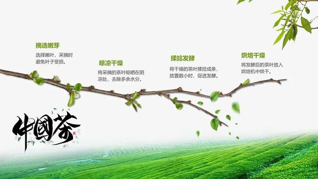 用一根刚刚发芽的茶树树枝来表达茶叶采摘制作的流程。