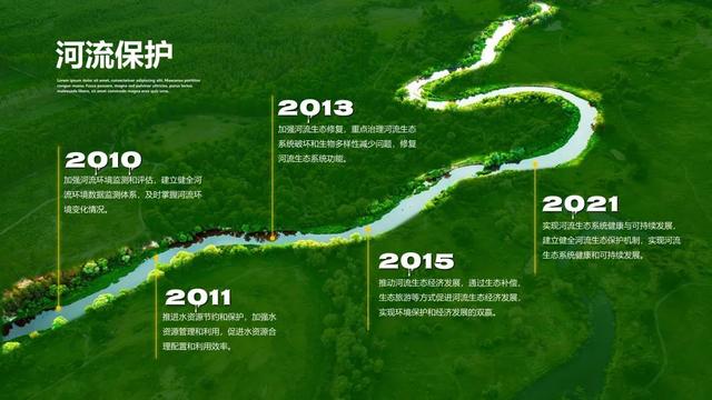 将河流图片设置为幻灯片背景,给图片添加蒙版,用曲线工具沿着河流将轮廓绘制出来,并选择幻灯片背景填充,最后,添加相应的文字。