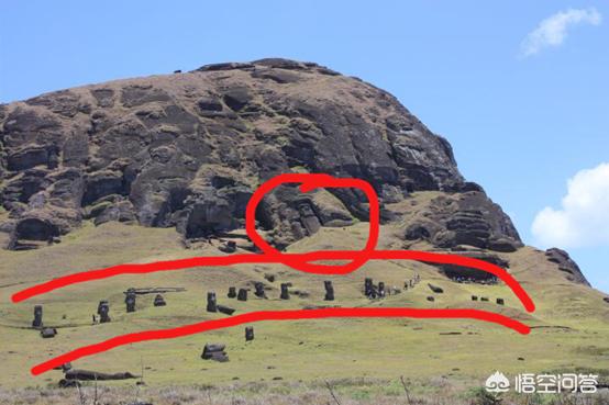 复活节石像的运输 上图是拉若廓火山,我们可以看到火山周围废弃着很多大小不等的石像,这些废弃的石像与运输石像的过程有关。 拉帕努依人在火山周围利用凝灰岩制造石像, 石像制作完毕后,要通过特殊的运输程序将石像移动到特定的地方,上图废弃的石像就是在运输过程中意外损毁的石像。