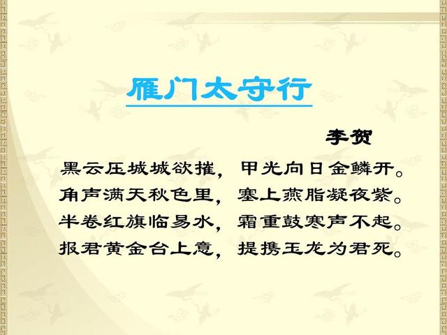 《雁门太守行》是唐代诗人李贺运用乐府古题创作的一首描写战争场面的诗歌。此诗用浓艳斑驳的色彩描绘悲壮惨烈的战斗场面,奇异的画面准确地表现了特定时间、特定地点的边塞风光和瞬息万变的战争风云。首联写景又写事,渲染兵临城下的紧张气氛和危急形势,并借日光显示守军威武雄壮;颔联从听觉和视觉两方面渲染战场的悲壮气氛和战斗的残酷;颈联写部队夜袭和浴血奋战的场面;尾联引用典故写出将士誓死报效国家的决心。全诗意境苍凉,格调悲壮,具有强烈的震撼力和艺术魅力。