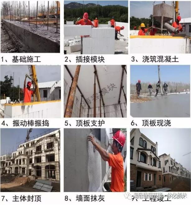 海容泡沫模块内外表面都是燕尾槽结构的,后期先抹一层粘结砂浆 贴抗裂网格布 再抹抹面砂浆,就可以的,,后期装饰跟传统一样了,没有区别。