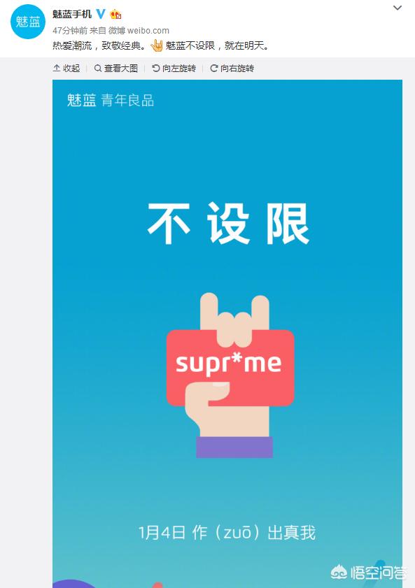 这张海报突出了两个重点,一是不设限,二是图案上的supr*me,首先我来分析下不设限,不受芯片限制?不受网络格式限制?不限量购买?这也跟目前大家猜测魅蓝新品处理器有关,有的说是高通处理器,有的说是三星处理器,如果处理器有多个版本的话,确实也能做到不限量发售。