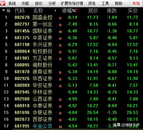 说说盘面吧。昨天证券群起发力,一举攻破3600,大盘助攻76点。收盘红旗摇动,满山红遍啊……有人高喊牛市浪来了,恨不得赶紧骑马提刀杀将过去,生怕错失一波赚钱的机会。结果今天证券兵败溃散,3600点站立不稳,一个跟头被证券拉下了水。证券上演一日游,真是成也萧何,败也萧何。